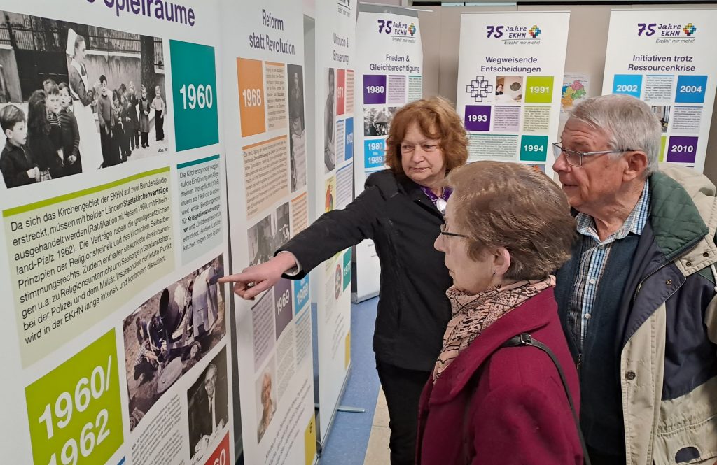 Die zwölf Schautafeln einer EKHN-Wanderausstellung zum vergangenen Jubiläumsjahr dienten als Anschauungsmaterial, um über Kirche von einst und jetzt nachzudenken. Themen, für die es Verbindungen in den Rhein-Lahn-Kreis gibt, griff Matern heraus. „So selbstverständlich heute mit Kerstin Janott bereits zum zweiten Mal eine Frau das Dekane-Amt ausübt, ist es nicht“, so der Referent. Er erinnerte an die verstorbene Evelin Clotz, bis 2006 Gemeindepfarrerin in Dachsenhausen. Sie war die erste Pfarrerin, die als verheiratete Theologin ihren männlichen Pfarrkollegen rechtlich vollständig gleichgestellt wurde, als sie im August 1971 zur Pfarrerin auf Lebenszeit ernannt wurde.