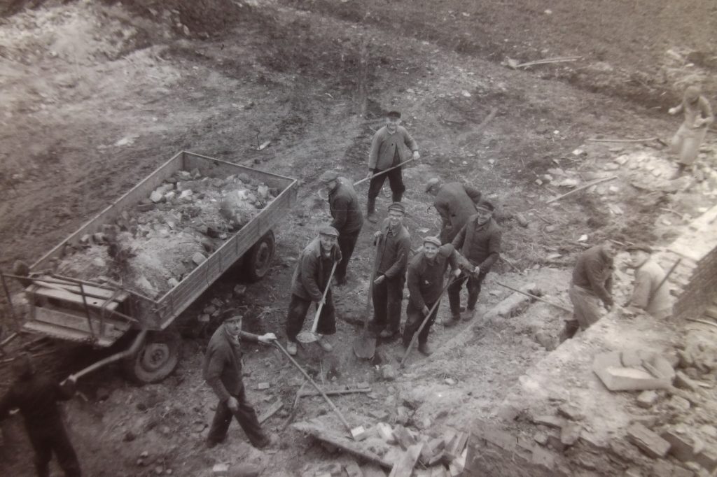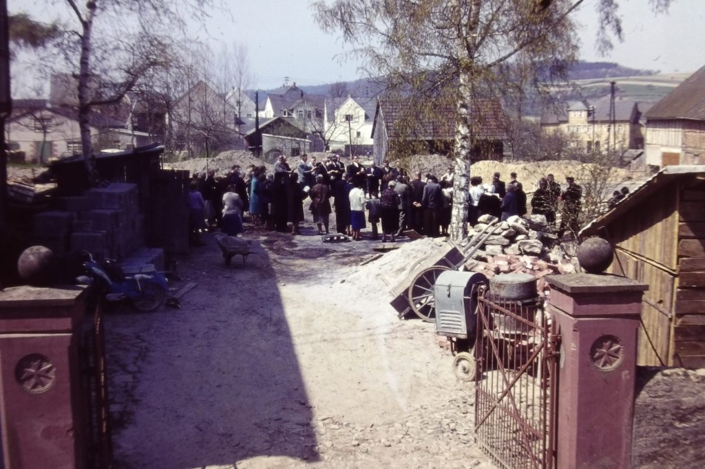 Nach einem Blick auf die Ausstellungstafeln wurde es ganz lokal und munter: Die Bilder vom Bau und der Einweihung des Miehlener Gemeindehauses aus dem Archiv des ehemaligen Dekans und Gemeindepfarrers Wilhelm Matern sorgten für Rätselraten, wer die einstigen Handwerker waren, die eine alte Scheune abrissen und den neuen Treffpunkt für die „aufgegliederte Gemeindearbeit an Männern und Frauen“, Jugend, Bibelstunden und Kirchenchor mit ganz viel Handarbeit und Herzblut schufen. Auch den Inhalt des Grundsteins las Matern vor, in dem noch um die Wiedervereinigung des „Vaterlandes“ gebetet wurde. Ein Bild erinnerte an die Anfänge des Seniorennachmittags der Gemeinde 1988.