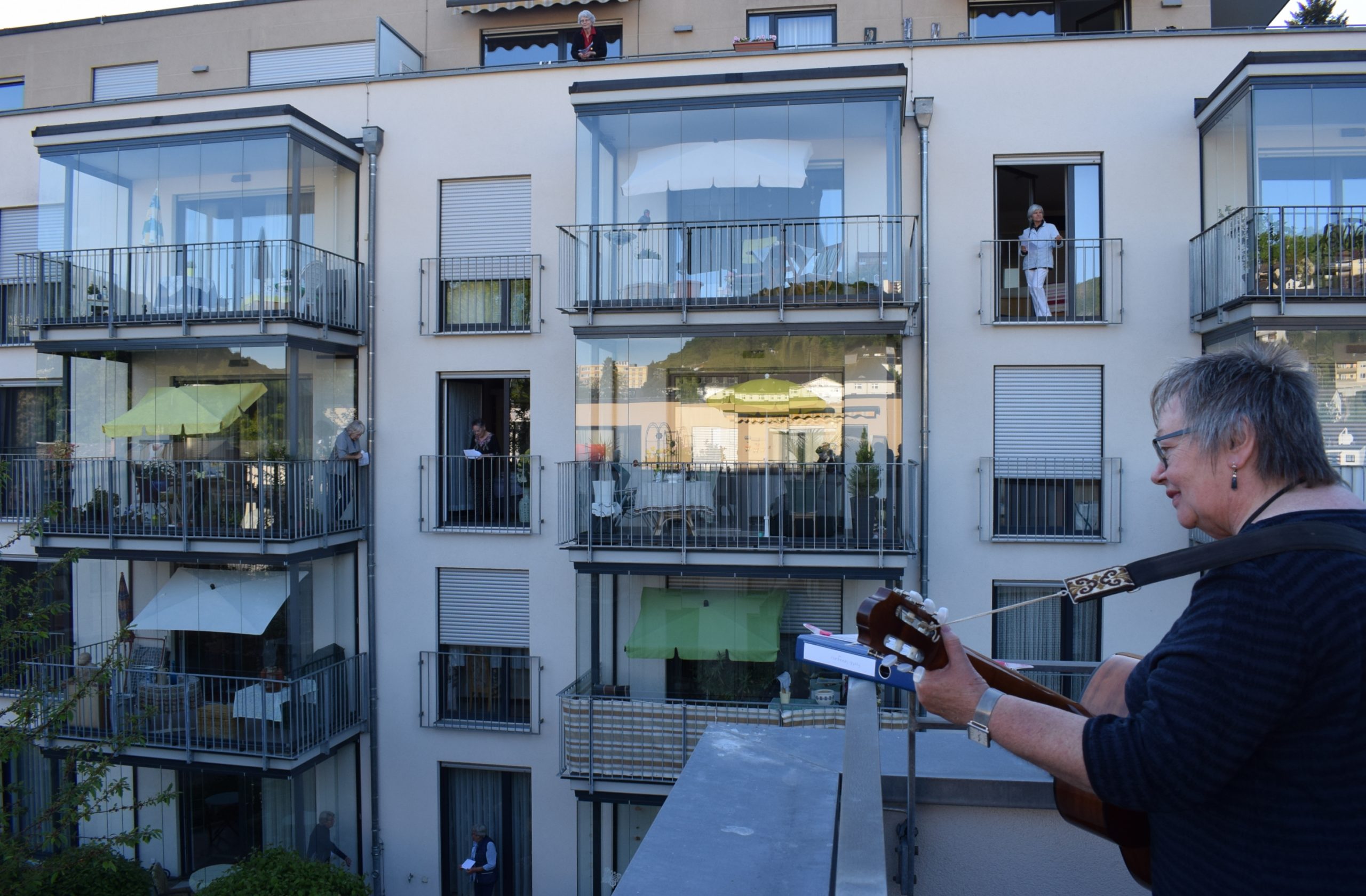 Mittlerweile begleitet Ulges auf ihrer Gitarre zu den sechs Strophen von „Der Mai ist gekommen“. Der Text wurde ebenso wie die Idee in die Briefkästen der Nachbarschaft verteilt und sorgt nach wie vor allabendlich für viel Freude. „Es tut uns einfach gut, im Singen mal fünf Minuten nicht an Corona zu denken“, sagt Ulges; das freundliche Zuwinken sowieso. Was in den jeden Abend rund einem Dutzend Mitsingenden vorgeht, kann die Musikantin nur erahnen, schließlich hat jede Person ihre eigene Biographie. Gerade für Menschen, die Kinder und Kindeskinder nicht mehr sehen dürfen und sich Gedanken um die Zukunft machen, sei das eine willkommene Gemeinschaft.