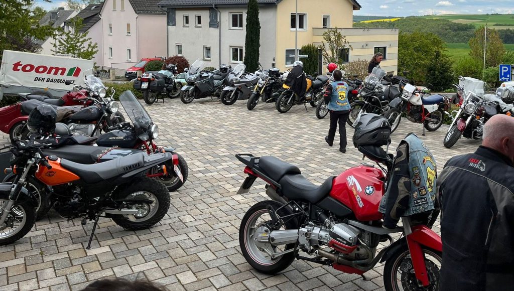 Dann ging es hinaus zu den Maschinen. Pfarrer Becker teilte die charakteristischen blauen Segensbänder aus, mit denen die Biker ihre Maschinen schmückten. So startete eine Rundfahrt Richtung Zollhaus, Reckenroth, Berndroth und zurück nach Mudershausen.
