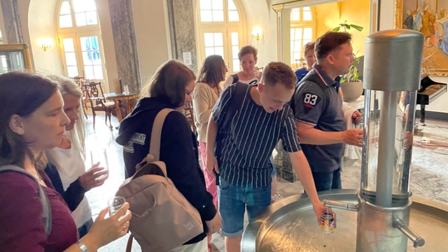 Die Quellen – wie hier in der Wandelhalle – wurden wörtlich genossen und sorgten wie der gesamte Oasentag für eine Stärkung von Körper und Seele der Mitarbeitenden. Ralf Skähr-Zöller führte die Mitarbeitenden des Elisabeth-Krankenhauses und der Stiftung Scheuern durch die Kurstadt. Fotos: Matthias Schmidt/Christine Kreutz