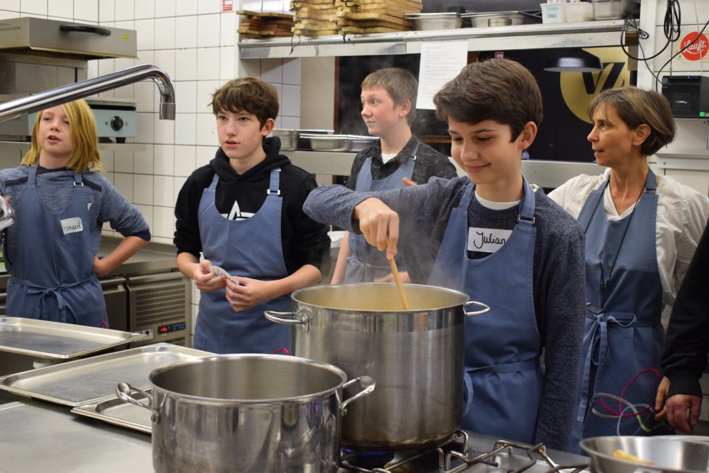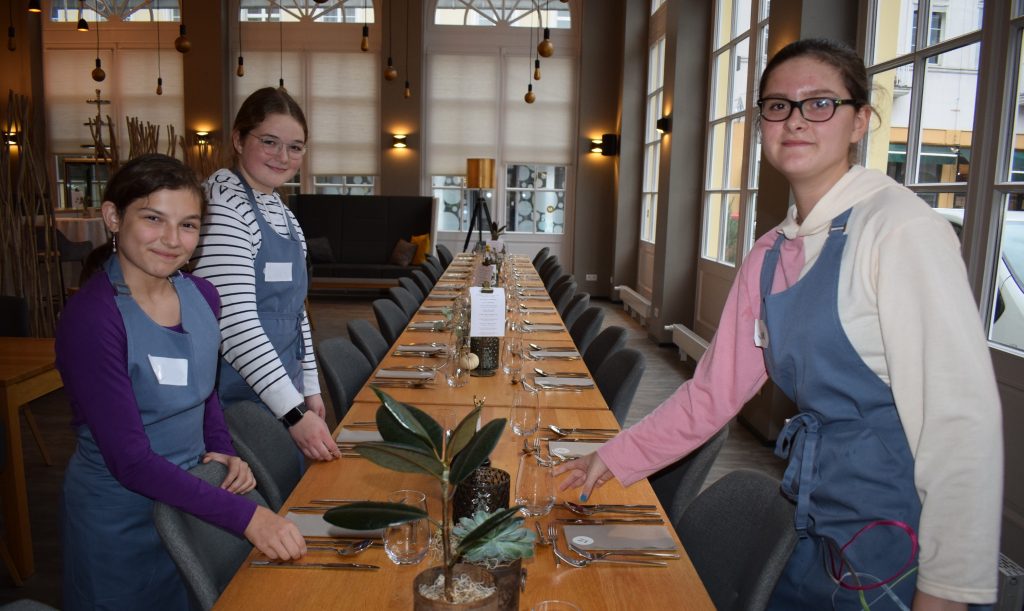 Hoch her geht es in der Profi-Küche des „VONUNDZU“ im Herzen der Welterbe-Stadt. Küchenchef Ruckdeschel und sein Team haben für die Jugendlichen jede Menge Aufgaben parat. Weil nur Frisches auf den Tisch kommt, gibt es jede Menge Gemüse zu waschen, zu schälen, zu schneiden und zu formen, bevor es in den Töpfen und Pfannen dampft und brutzelt. Der Küchenchef erklärt, wo genau im Rhein-Lahn-Kreis die Zutaten gewachsen sind. Vier Stunden später wird das Werk der jungen Hände an den ebenfalls von ihnen stilvoll eingedeckten und dekorierten Tischen im Restaurant serviert: Kartoffel-Blinis und Lachstatar, eine Karotten-Ingwer Suppe und die gebratene Salbei-Maispoulardenbrust nebst „Rosmarin Jus“ und feinen Rübchen und Spätzle gibt es zu genießen. Zum krönenden Abschluss dann ein Parfait von weißer Schokolade mit Karamellsauce. Zu jedem Gang gibt’s für die verwandten Gäste Erläuterungen der Jugendlichen.