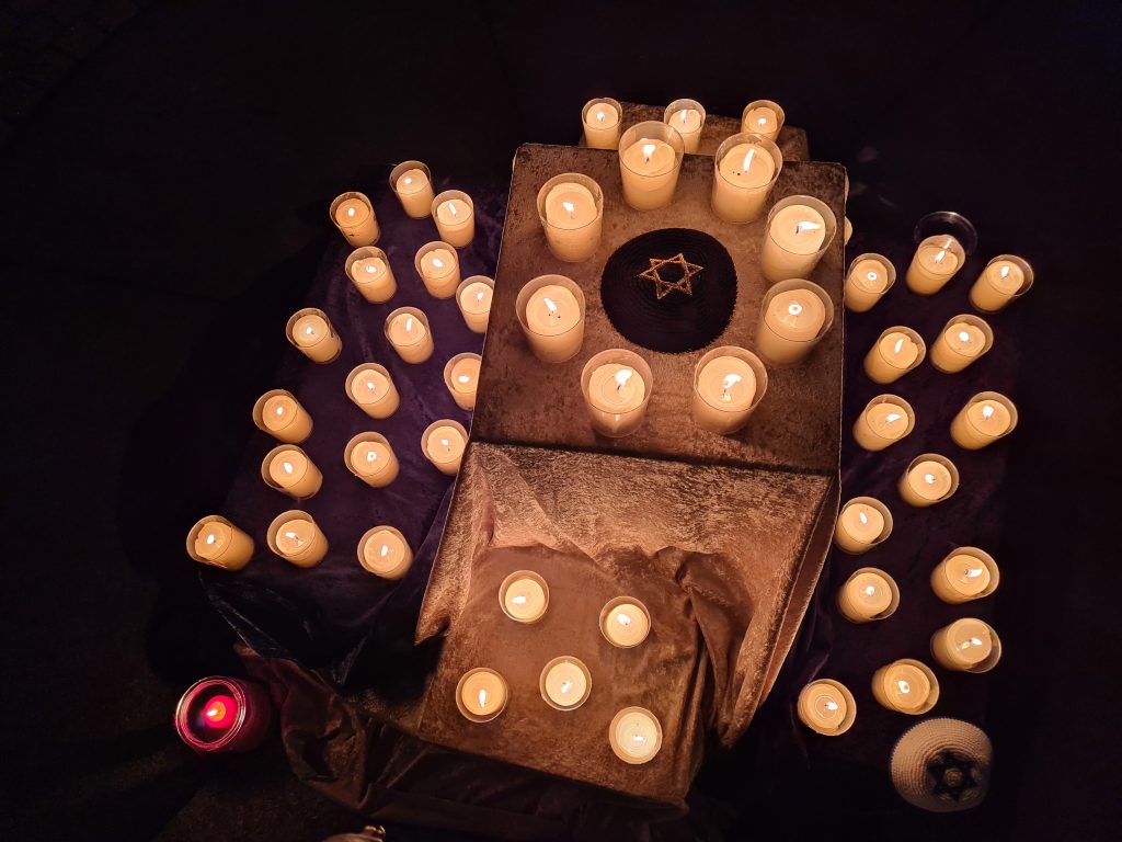 Auch Schülerinnen und Schüler des Goethe-Gymnasiums und der Realschule plus wirkten beim Gedenken mit ihren Lehrern David Schmidt und Elisabeth Knopp mit, verlasen mit den Dekanatsmitarbeitenden Claire Metzmacher, Matthias Metzmacher und Ralf Skähr-Zöller etwa die Namen der Opfer, für deren Seelen die Kerzen in der Mitte des Platzes brannten. Schüler des Goethe-Gymnasiums hielten ein Referat über das Schicksal von Ruth Cohn. Besonders bewegend war der hebräische Gesang des Projektchores „Schir“ unter Leitung von Jochen Liefke und der gesungene Psalm von Schwester Jerusalem, einer griechisch-orthodoxen Nonne jüdischer Abstammung, die jetzt im Kloster Arnstein lebt.