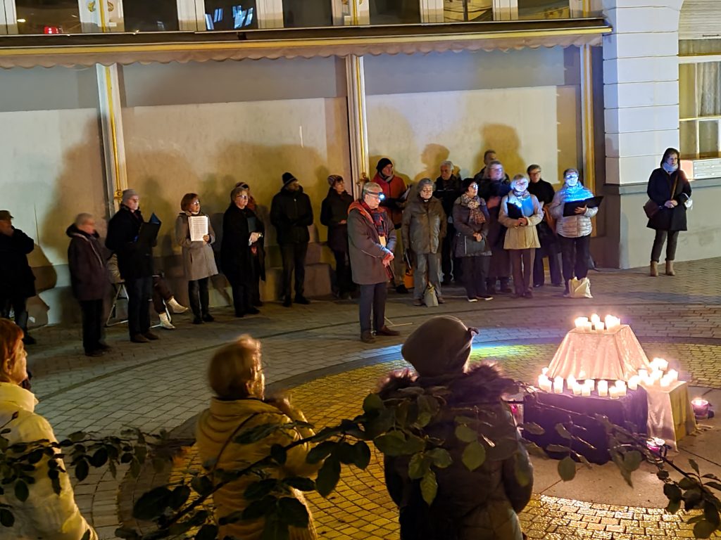 BAD EMS/RHEIN-LAHN. (15. November 2021) Zum Gebet und Gedenken hatte die Ökumene-Pfarrerin des evangelischen Dekanats Nassauer Land Antje Müller nach Bad Ems eingeladen. Treffpunkt war in diesem Jahr der Bahnhofvorplatz unweit des Wohnhauses von Ruth Cohn, an deren Leben in der Mainzer Straße 7 ein Stolperstein erinnert.
