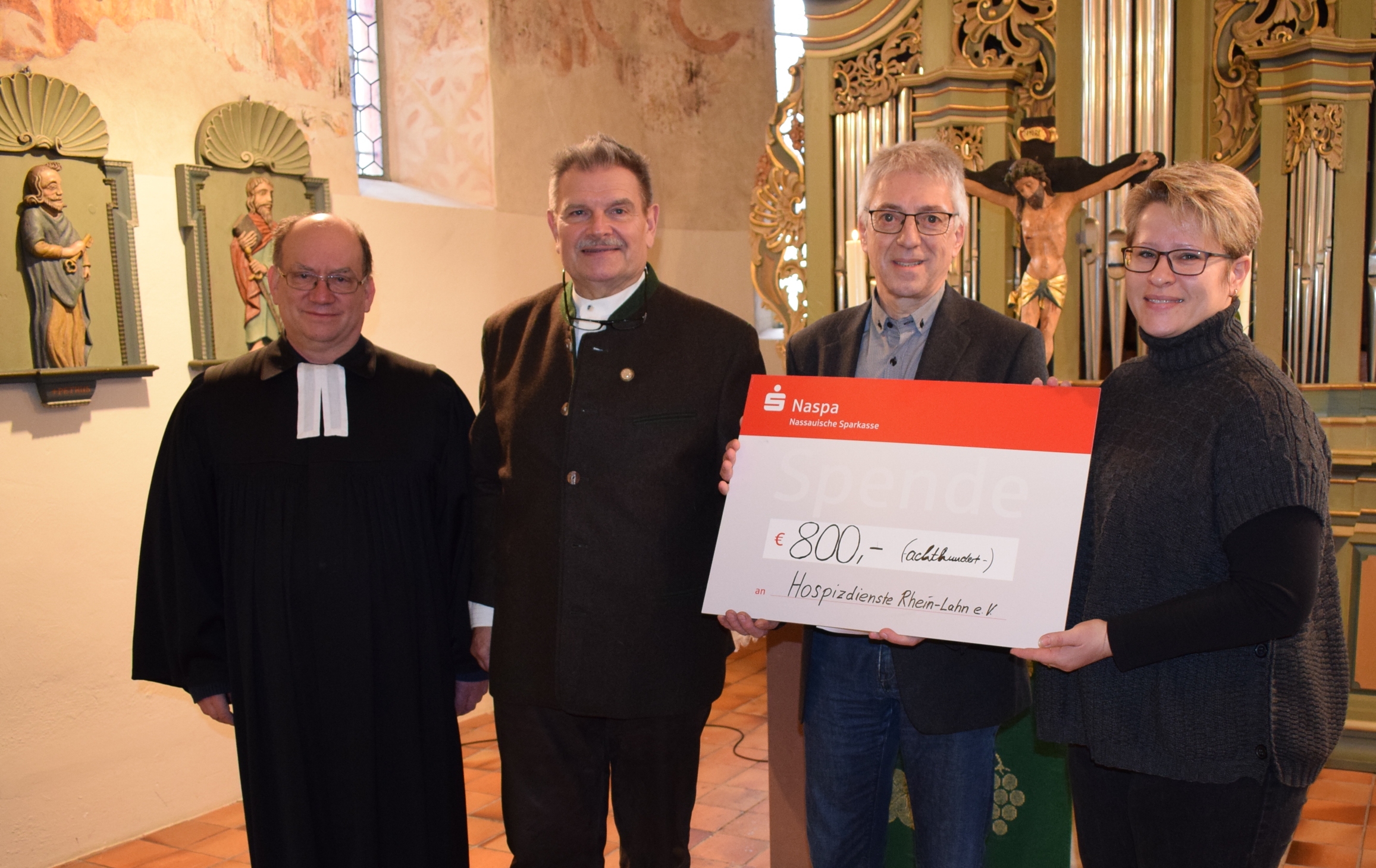 MIEHLEN/RHEIN-LAHN. (5. März 2020) Mit einer Spende in Höhe von 800 Euro unterstützt die evangelische Kirchengemeinde Miehlen den ambulanten Hospizverein Hospizdienste Rhein-Lahn mit Sitz in Bad Ems. Während eines Gottesdienstes überreichte Kirchenvorstandsvorsitzender Dr. Ulrich Werner zusammen mit Gemeindepfarrer Michael Wallau den symbolischen Scheck an die Vorsitzende des Vereins Mandy Nicklaus und Koordinator David Brenner.
