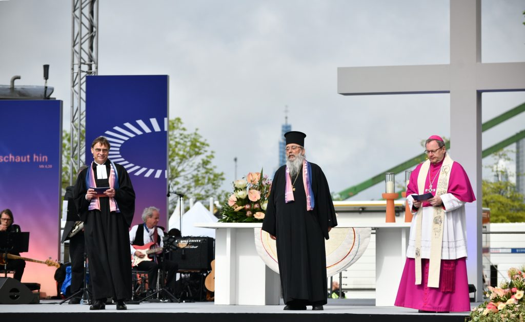 oben: Der Abschlussgottesdienst von der Weseler Werft (Foto oben) wurde liturgisch geleitet vom Kirchenpräsidenten der Evangelischen Kirche in Hessen und Nassau (EKHN), Volker Jung, dem griechisch-orthodoxen Erzpriester Radu Constantin Miron, der ebenso Vorsitzender der Arbeitsgemeinschaft Christlicher Kirchen in Deutschland (ACK) ist, und dem Limburger Bischof Dr. Georg Bätzing (von links). Foto: ÖKT/Weiss