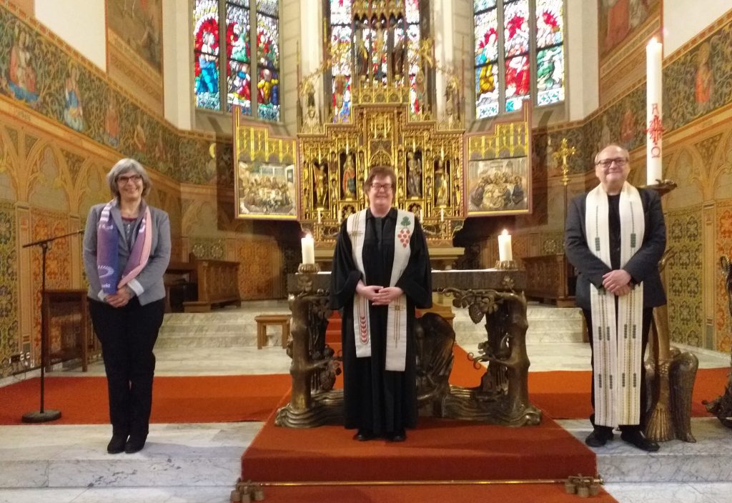 In Bad Ems gab es eine ökumenische Abendandacht mit Pfarrer Michael Scheungraber, der Ökumene-Beauftragten des evangelischen Dekanats Nassauer Land Pfarrerin Antje Müller und der freikirchlichen Pastorin Magdalene Kolar (von rechts). Foto: Dekanat Nassauer Land