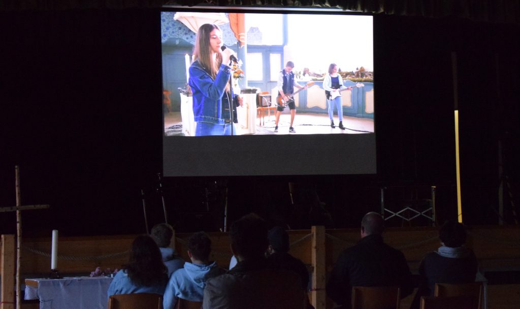 rechts: In der Stadthalle Katzenelnbogen gab es während eines Gottesdienstes am Samstagabend von den 40 Gästen Beifall für die Jugendband der evangelischen Kirchengemeinde Klingelbach, die vom Kulturprogramm des ÖKT eingespielt wurde. Foto: Matern