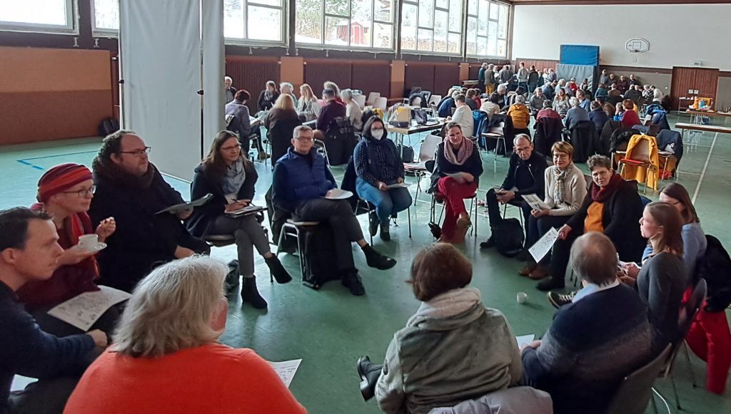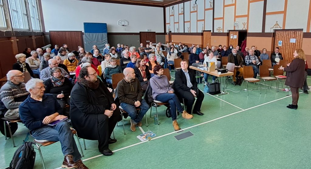 RHEIN-LAHN. (27. Januar 2023) Erneut trafen sich Kirchenvorstände aus dem gesamten evangelischen Dekanat Nassauer Land, um über künftige Nachbarschaftsräume zu beraten, in denen sich ab dem kommenden Jahr noch stärker als bisher über den eigenen Kirchturm hinaus blicken und weiterentwickeln lässt. Mehrere Kirchen- und Gesamtkirchengemeinden sollen darin noch enger zusammenarbeiten. Hintergrund ist vor allem die sinkende Zahl von Pfarrpersonen. Diese sollen nach dem Beschluss der Kirchensynode künftig als Team in einer Region zusammenarbeiten. Die neuen Räume sind Teil des Entwicklungsprozesses „ekhn20230“ der Evangelischen Kirche in Hessen und Nassau (EKHN). Der Synodalvorstand des Dekanats (DSV) hatte dazu in die Hombachhalle nach Geisig eingeladen.