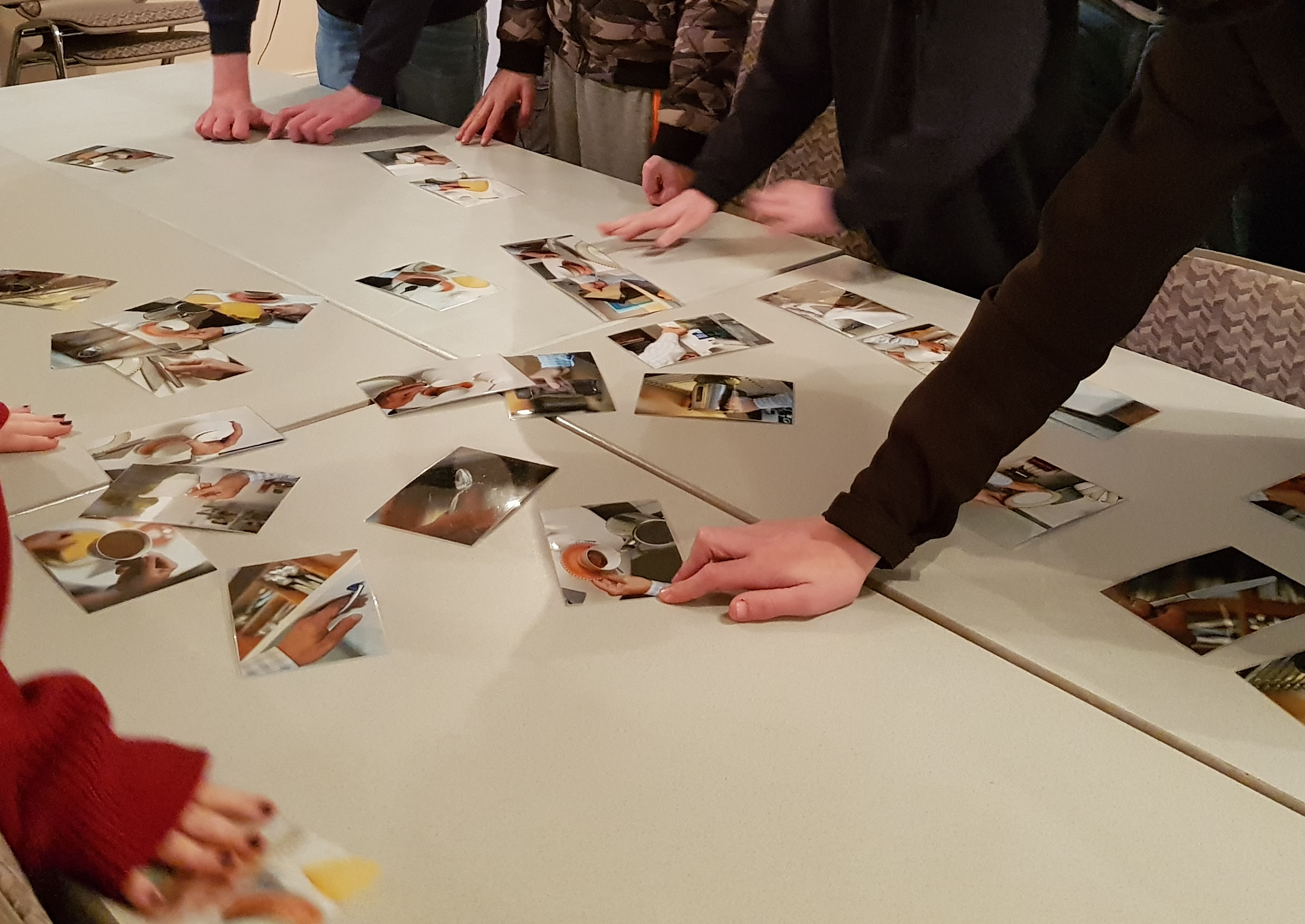 Dass es mehr als 40 einzelne – aufeinander abgestimmte – Arbeitsschritte erfordert, um für eine Person den Frühstückstisch zu decken und das Frühstück zu richten, war nicht einmal so schwer zu erraten. Diese Schritte dann aber noch anhand von gut gemischten Fotokarten in die richtige Reihenfolge zu bringen erforderte dann doch noch einige Zeit. Jedoch wurde auch diese Aufgabe mit vereinten Kräften von beiden Gruppen perfekt gelöst.