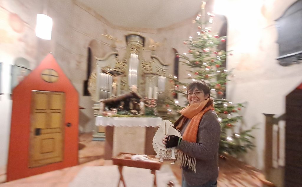 Froh ist sie immer, wenn sich ein Freiwilliger für die Rolle des Joseph begeistern lässt. „Ab einem gewissen Alter ist es halt nicht mehr so cool, neben einem Mädchen auf dem Präsentierteller zu stehen“, lacht Schwank. Aber bislang wurde sie stets fündig für die Rollen-Besetzung. Hie und da schreibt sie noch einen Satz in die Vorlage für sprechwillige Darstellerinnen. Auch etwas Spaß tut der Aufführung gut. Die Corona-Pandemie war dagegen eine herbe Enttäuschung für die Kindergottesdienst-Kinder. Um nicht ganz ohne Weihnachtsgeschichte Weihnachten zu verbringen, schuf sie mit ihrem Mann 2020 große bunte Hölzer, die auf der Wiese vor der Kirche Woche für Woche mit mehr Brettern vom froh machenden Evangelium kündeten. Immerhin: Im vergangenen Jahr wurde die Krippenspiel-Geschichte per Video aufgezeichnet und dann den Gottesdienstbesuchern an Heilig Abend in der Kirche auf einer Leinwand vorgespielt. In diesem Jahr machen krankheitsbedingte Ausfälle der jungen Schauspielgruppe zu schaffen. Weil schon zur alljährlichen Feuerprobe des Stücks beim Generationen-Kaffee der Kirchengemeinde mehrere kleine Künstler fehlten, wurde in dieser Woche noch einmal eine Extra-Probe eingeschoben, damit Texte und Gesang, den Anke Rammersbach-Schade am Klavier begleitet, gelingen. Die Worte und Einsätze sitzen zwar, „aber die Aufregung ist doch ganz schön groß bei den kleinen Künstlern“, erzählt Schwank einen Tag vor dem Auftritt in der vollbesetzten Kirche.