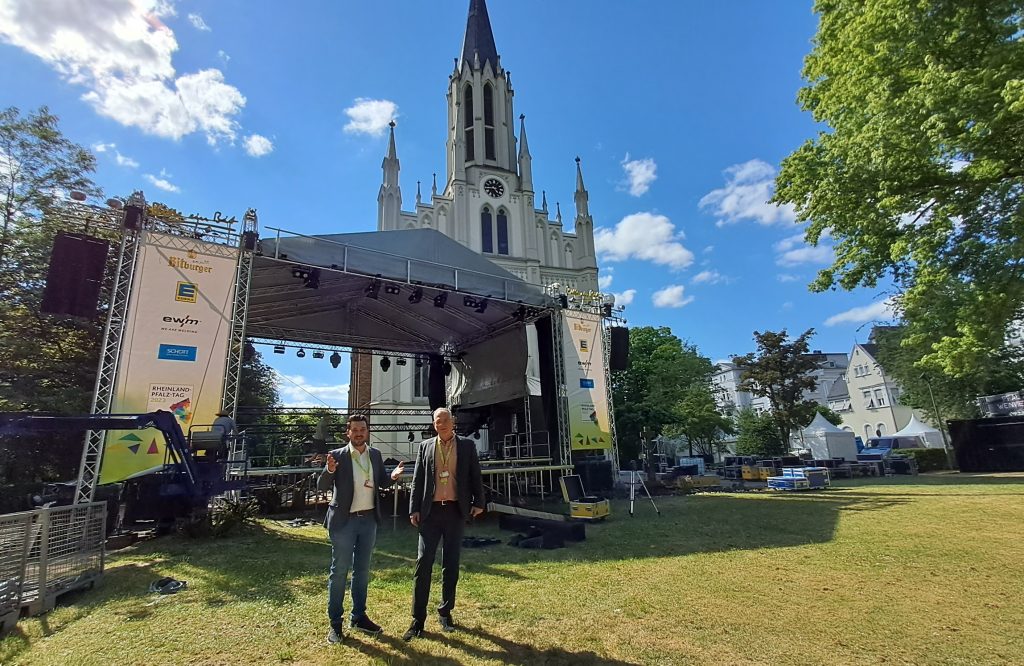 Welch einzigartige logistische Herausforderung hinter dem Fest steckt, erklärt Christoph Häusl von der Mainzer Staatskanzlei, die gestern zu einem Rundgang über das Veranstaltungsgelände eingeladen hatte. Der reichte vom Hasenkümpel, wo Radio RPR1 und BigFm für tolle Konzerte mit bis zu 5000 Fans vor dem Bühnentruck sorgen, bis hin zum Kurgebäude. Vor der Spielbank mit bis zu 750 Zuschauerinnen und Zuschauern haben Stadt und Verbandsgemeinde ihre kommunale Bühne errichtet und warten mit einem eigenen Programm auf. Dort wird unter anderem der ökumenische Gottesdienst am Samstag um 10 Uhr mit Bischof Georg Bätzing und Kirchenpräsident Volker Jung gefeiert. Rockiges gibt’s auf der Wipsch, coole Songs auf der BEN-Kurier-Bühne an der Realschule. Vor der katholischen Martinskirche befindet sich die Landesbühne. Mitten im Kurpark steht die größte Bühne, die des Südwestrundfunks, der am Freitagabend ab 20.15 live vom Landesfest berichtet. Unter anderem wird darin auch der international rennomierte Street-Art-Künstler Edgar Müller aus Bad Ems sein Projekt vorstellen, dass er für die evangelische und katholische Kirche in der Gartenstraße zeigt. Hier gibt’s dazu mehr Infos.