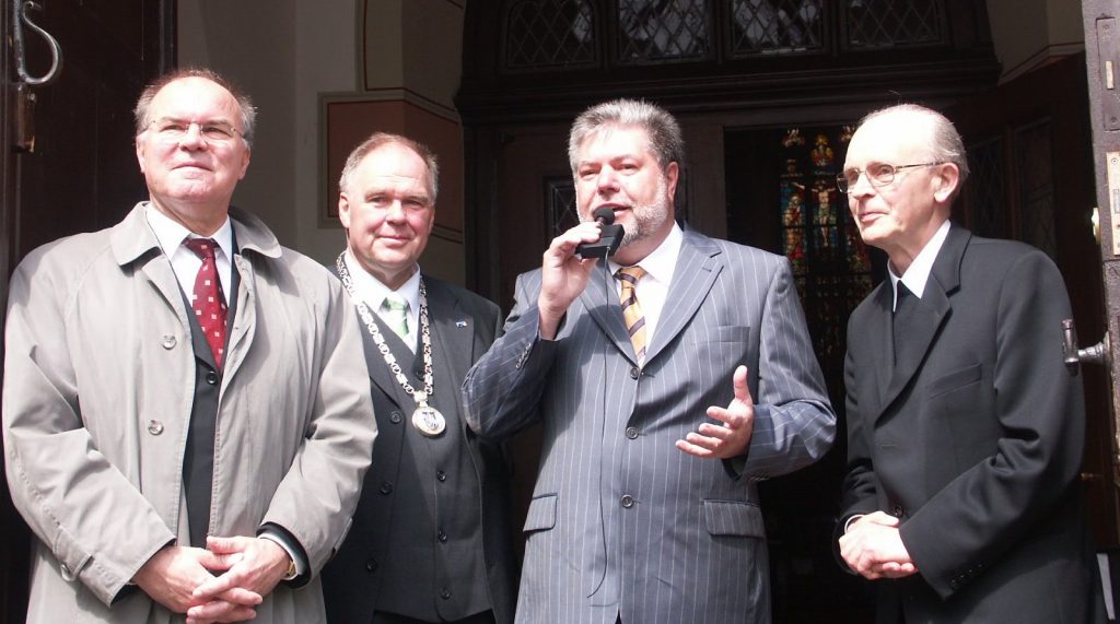 Offizielle Eröffnung des Rheinland-Pfalz-Tages 2005 nach einem Festgottesdienst in der Martinskirche mit (von links): Kirchenpräsident Peter Steinacker, Stadtbürgermeister Ottmar Canz, Ministerpräsident Kurt Beck und Bischof Franz Kamphaus. Foto: B.-Chr. Matern