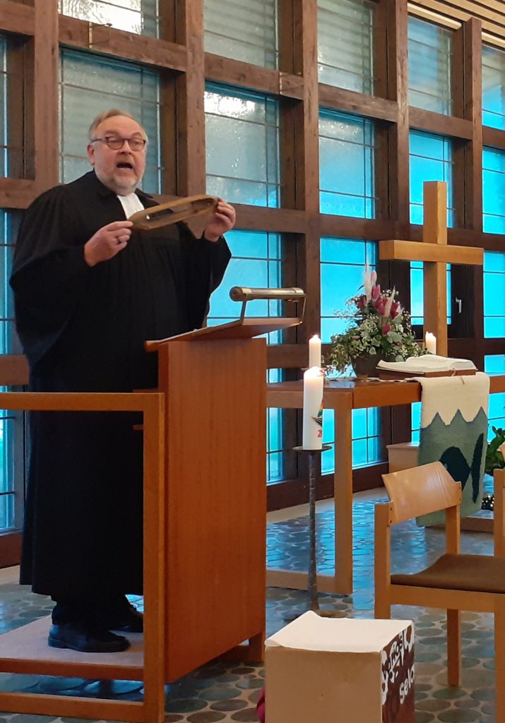 In seiner Predigt umschrieb Schmidt das gleiche Ziel mit einem Weberschiffchen. Ein gut anschauliches, großes Exemplar aus dem Arbeiten mit historischen Webstühlen hatte er dazu mitgebracht. Wenn er nun sein Amt ausübe, so wolle er ähnlich eines Weberschiffchens im Lebensgewebe der Menschen wirken: zurückblicken auf das bereits vorliegende Muster, die Farben, die abgerissenen und auch die wieder angeknüpften Fäden, das Einweben neuer Fäden, aber auch vorausschauen und sich ausmalen, wie das Lebensgewebe mit Mustern und Farben fortgeführt werden könne. Mit Blick auf den Lesungstext zur Taufe Jesu und den vom ihm gewählten Psalm 139 sei es gut zu wissen, so Schmidt, dass jeder Mensch mit seinen Farben, Mustern, den Abbrüchen und auch den Fehlstellen von Gott geliebt sei. Auf dieses bunte Gewebe in Vergangenheit und erst recht in Zukunft freue er sich und wolle gerne mit offenem Herzen daran mitwirken.