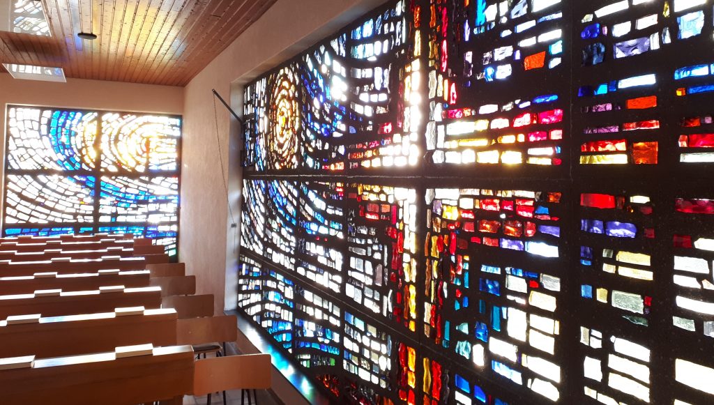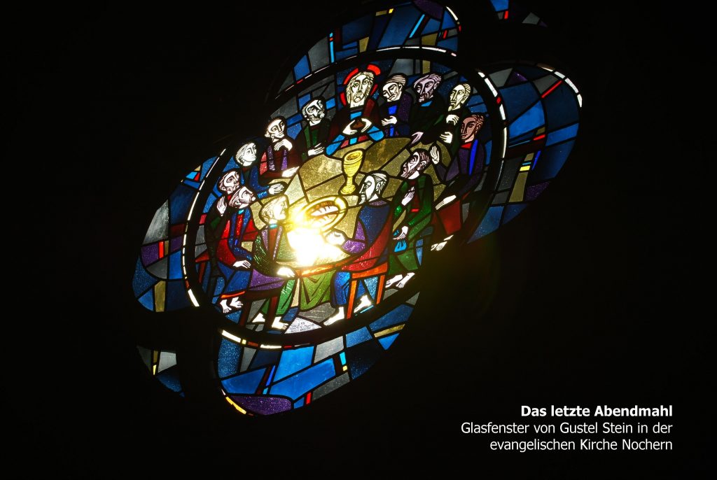 Karfreitag und Ostern – für Christen bedeutet das vom Dunkel ins Licht. Dass der Blick auf das Kreuz, an dem Jesus von Nazareth hingerichtet wurde, den Glauben ans Ewige Leben festigt, zeigen nicht nur die die Altäre in Kirchen wie in Miehlen, sondern auch Fenster in den Trauerhallen des Rhein-Lahn-Kreises, wie hier in Nastätten. Das Glasfenster des Künstlers Gustel Stein mit der Darstellung von Jesu letztem Abendmahl mit seinen Jüngern findet sich in der evangelischen Kirche von Nochern. In der evangelischen Kirche von Dienethal blühen Forsythien vor dem Auferstehungsfenster im Altarraum. Fotos: Dekanat/Matern