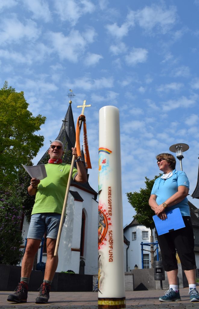 Mit dabei: die Wanderfriedenskerze von Pax Christi, mit der 2002 erstmals an die weltweiten Opfer von Terror und die Folgen des Anschlags vom 11. September 2001 erinnert wurde und die dazu aufruft: „Suche Friede und jage ihm nach“. In diesem Jahr soll ihr Licht insbesondere an die „verbrannte Erde“ erinnern, an die Schöpfung, Tiere und Pflanzen, die in Kriegen zerstört werden. „Wir bitten um Mut und Hoffnung, Liebe zu säen in einer Welt der Feindschaft“, hieß es in einem Gebet, bevor sich die Gruppe mit der besonderen Kerze nach Strüth auf den Weg machte.