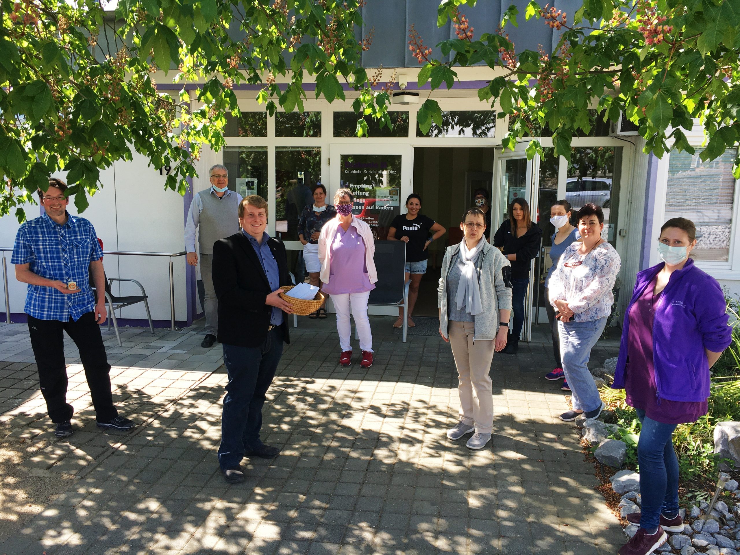 Die Pflegekräfte der Sozialstation freuten sich über die unerwartete Gratifikation ihres Einsatzes in schwierigen Zeiten, die ihnen die Osteraktion bescherte. Axel Großmann, Pfarrer Christian Dolke, Pfarrer Manuel Fetthauer (von links) und Pfarrerin Maike Kniese (3. von rechts) überreichten die Spende ans Team.