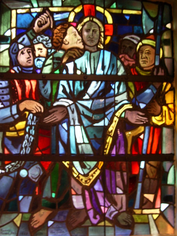 Das Bild zeigt ein Fenster von Rudolf Fuchs in der evangelischen Johanniskirche Nassau: Die Gefangennahme Jesu.