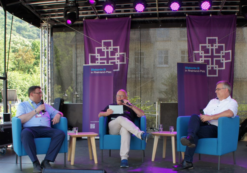 BAD EMS/RHEIN-Lahn. (20. Juni 2023) Das Ansehen der beiden christlichen Kirchen in der Öffentlichkeit sowie die Personalnot und der Fachkräftemangel in Pflege und Kindertagesstätten im Land und dem Rhein-Lahn-Kreis – das waren unter anderem Themen, die auf der „Blauen Couch“ der Diakonie auf der hessen-nassauischen Bühne diskutiert wurden.