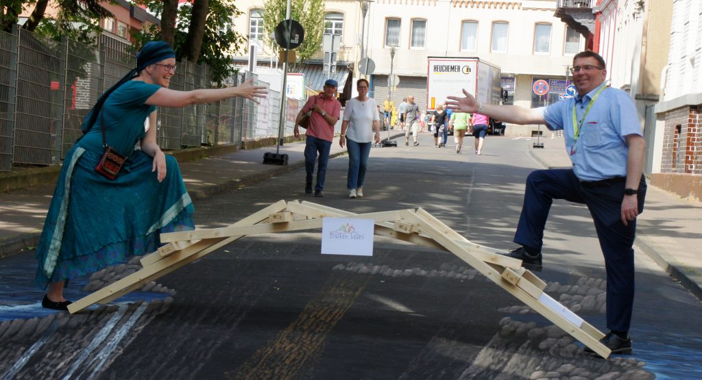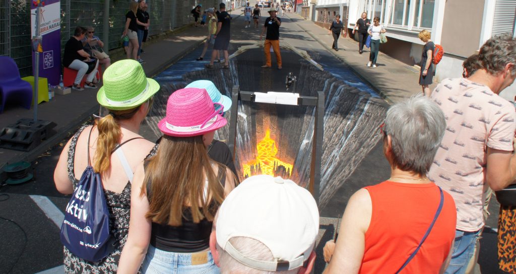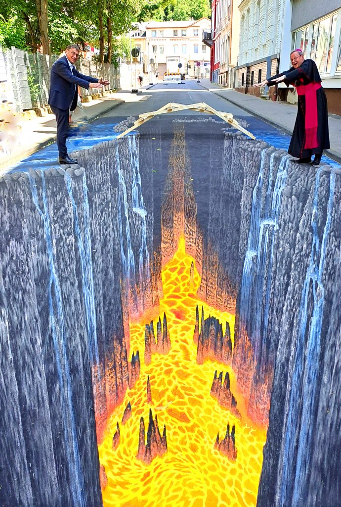 Zum echten Hingucker entwickelte sich ein Straßenkunst-Projekt der Kirchen auf dem Rheinland-Pfalz-Tag. Ein klaffender Abgrund aus Felsen mit Blick auf Lava und Wasserströmen in 3D-Optik ließ Passanten erschaudern. Der Street-Art-Künstler Edgar Müller hatte das Bild in einwöchiger Arbeit auf dem Boden in Bad Ems geschaffen. Unter Anleitung der Evangelischen Jugend im Dekanat Nassauer Land versuchten sich viele Menschen darin, eine Leonardo-Brücke über den Abgrund zu bauen, die aus losen Balken besteht. Kein leichtes Unterfangen und ähnlich schwierig, wie sich in diesen Zeiten Brücken zwischen den gesellschaftlichen Gruppierungen bauen lassen. Das Werk mutierte zu einem beliebten Foto-Motiv beim Landesfest.