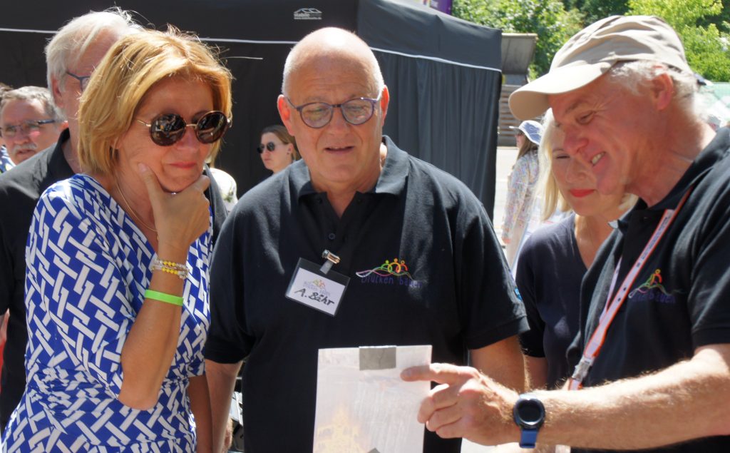 Brücken bauen: Das nehmen die evangelische und katholische Kirche wörtlich. Über den 3D-Abgrund von Street-Art-Künstler Edgar Müller bauten sie eine Leonardo-Brücke. Kirchenpräsident Volker Jung und Bischof Georg Bätzing wagten sich– nicht ohne Selbstironie – darauf, um sich die Hände auszustrecken ebenso wie Dekanin Kerstin Janott und Landrat Jörg Denninghoff.