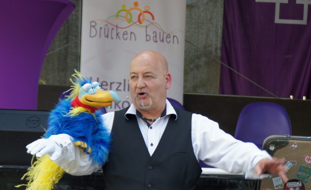 Besucherinnen und Besucher der Kirchenauftritts erwartete ein abwechslungsreiches Programm aus Comedy, Gospel, Pop und Rock auf der Kirchenbühne in der Viktoriaallee. „Eine der schönsten Formen des Brückenbauens ist, miteinander zu singen“, begrüßte Fabian Vogt mit Band zum Auftakt mit bekannten Songs. Vor allem Kinder zog der zauberhafte Schmittini in seinen Bann und brachte sie zum Kreischen. Erfrischend das Comedy- und Musik-Duo „Superzwei“, die mit hessischer Lebensart den Rheinland-Pfalz-Tag infizierten: „Ich bin Hesse und muss was esse“. Unterschiedlichste musikalische Geschmäcker wurden gestillt.