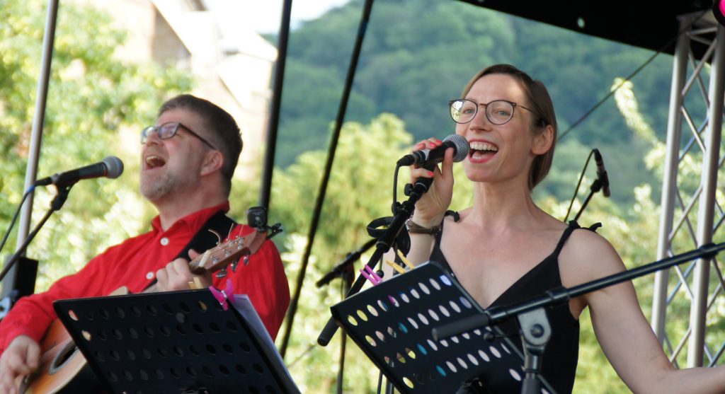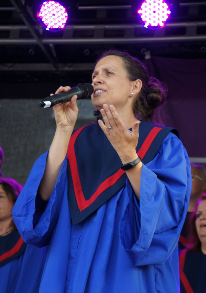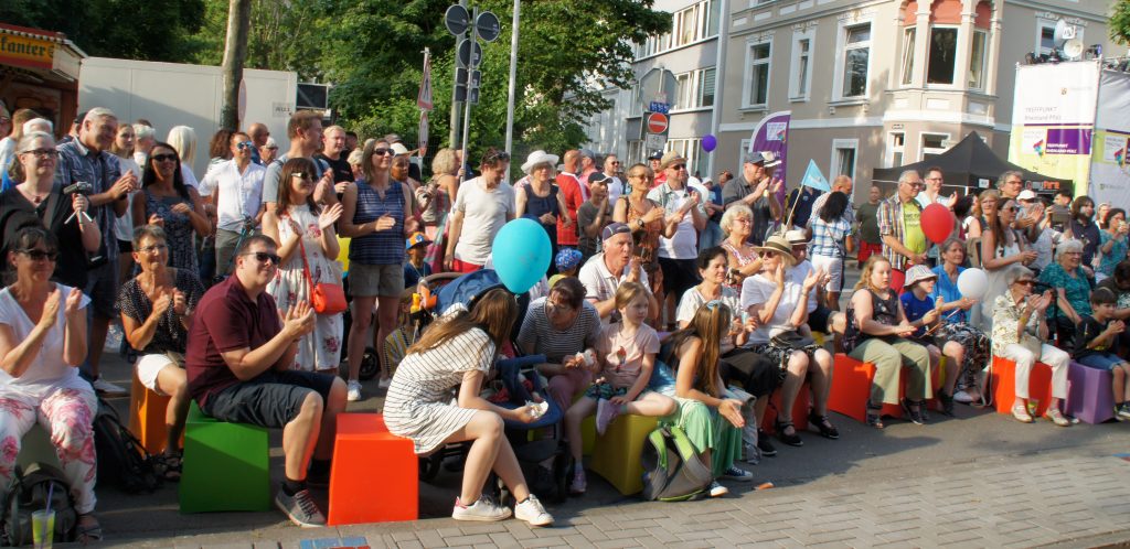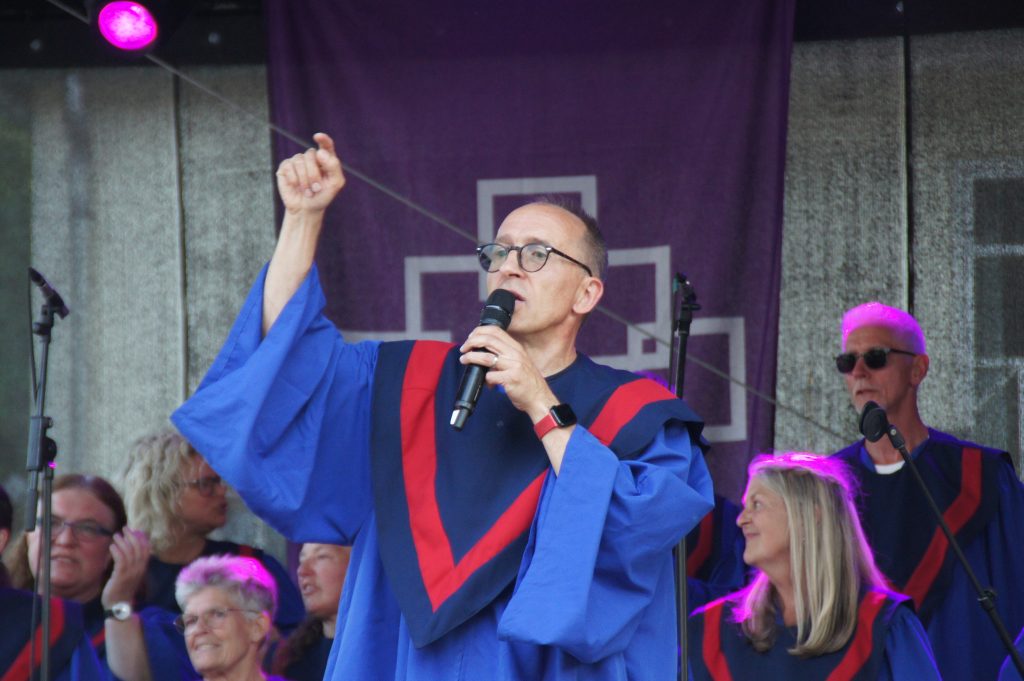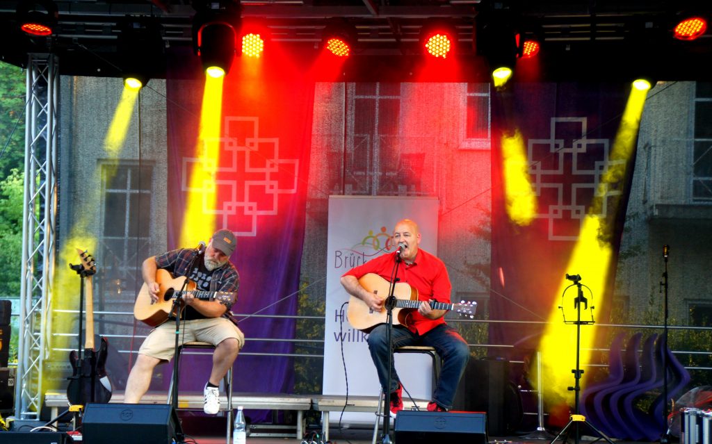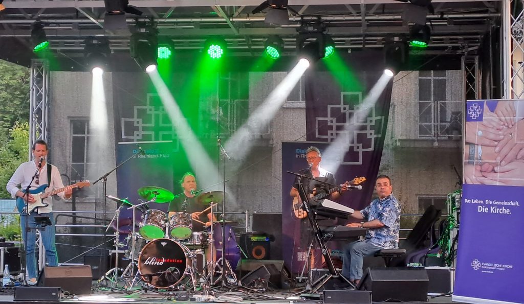 Ein Glanzpunkt: die Band „Blind Foundation“ mit sehbehinderten Menschen, die es mit ihren Gigs mit Pop und Rock ordentlich krachen ließ. Gefühlvolle Balladen servierte Singer-Songwriter Thilo Distelkamp aus Neuwied. In doppeltem Sinn in Bewegung brachten die „Blue Land Gospel Voices“ mit Mitgliedern aus der ganzen Region das Publikum. Chorleier Hans-Jörg Fiehl war ein echter Begeisterer und Brückenbauer, der die Menge vor der Bühne sogar zum mehrstimmigen Mitsingen motivierte.