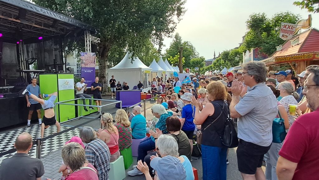 BAD EMS/RHEIN-LAHN. (20. Juni 2023) „Solidarisch“– in diesem Themenfeld haben sich die evangelische und katholische Kirche sowie die Diakonie während des Rheinland-Pfalz-Tages mit Street-Art und Action in Bad Ems präsentiert. Zu einem Hingucker entwickelten sich nicht nur die mehr als ein Dutzend Auftritte der Artistengruppe „Flyguys“, die dem Kirchenmotto „Brücken bauen“ ordentlich auf die Sprünge halfen. Aus einem Sozialprojekt in Bochum entstanden, sind die Straßen-Artisten heute weltweit mit ihren Shows unterwegs, die an den Mode-Sport Pakour angelehnt sind. Mit einer speziell für den Kirchenauftritt entwickelten Choreographie mit waghalsigen Sprüngen schafften sie es, Brücken zwischen den Menschen zu schlagen und Besucherinnen und Besuchern ein Staunen ins Gesicht zu zaubern.