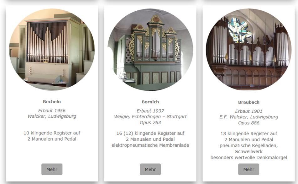 Die Website bietet außerdem einen Überblick über die 30 Veranstaltungen, die von den Dekanatskantoren Martin Samrock, Ingo Thrun und Markus Ziegler im Jahr 2020 schon jetzt geplant sind. Im Mittelpunkt der Website steht die Dokumentation der insgesamt 72 Pfeifenorgeln, die es im Dekanat Nasssauer Land gibt. Auf den Detailseiten zu den Orgeln von Ackerbach bis Weyer bietet die Dokumentation zu jedem Instrument eine ausführliche Beschreibung zu Erbauer und Baujahr und die komplette Disposition der Orgel, also sämtliche Register, über die das Instrument verfügt; einzelne Bildergalerien und teilweise weiter führende historische Informationen sowie Links zur Kontaktaufnahme der Kirchengemeinden runden die Dokumentation ab.
