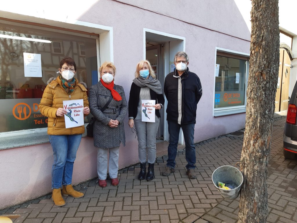 NASTÄTTEN/RHEIN-LAHN. (15. Februar 2021) Eine Spende in Höhe von 300 Euro hat das Vokalensemble Rhein-Lahn an die Tafel des Diakonischen Werkes Rhein-Lahn in Nastätten überreicht. Eigentlich hätte der Chor im vergangenen Jahr gern sein 25-jähriges Bestehen gefeiert, zwei Jubiläums-Konzerte in Bad Ems und Braubach waren vorgesehen. Doch die Pandemie machte dem Chor einen Strich durch die Planung. „Das haben alle Sängerinnen und Sänger sehr bedauert“, sagte Chorsprecherin Edith Potthas während der Spendenübergabe an Marion Moll in Nastätten. „Das hielt die Mitglieder aber nicht davon ab, an die Menschen zu denken, die gerade ganz andere Sorgen und Probleme haben“, berichtete Potthas vom Spendenaufruf in den eigenen Reihen. Sich auf alte Werte zu besinnen, Empathie, Mitgefühl und Anteilnahme zu zeigen, sei in dieser Situation besonders wichtig, „vor allem Dankbarkeit und auch ein wenig Demut, wenn man das Glück hat und nicht selbst erkrankt.“