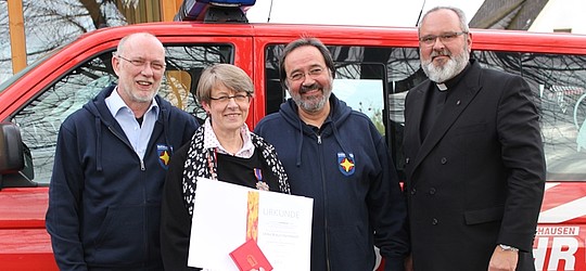 Bezirksreferent Stephan Geller (v.l.), Pastoralreferent Rainer Dämgen und Dekan Dr. Axel Wengenroth freuen sich mit Pfarrerin Ulrike Braun-Steinebach über die hohe Auszeichnung der Feuerwehr. Foto: Sabine Hammann-Gonschorek