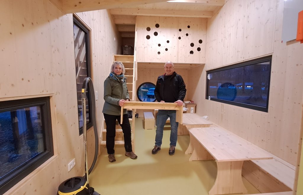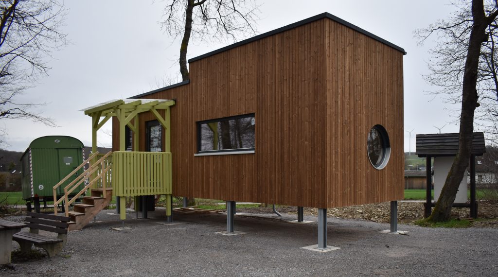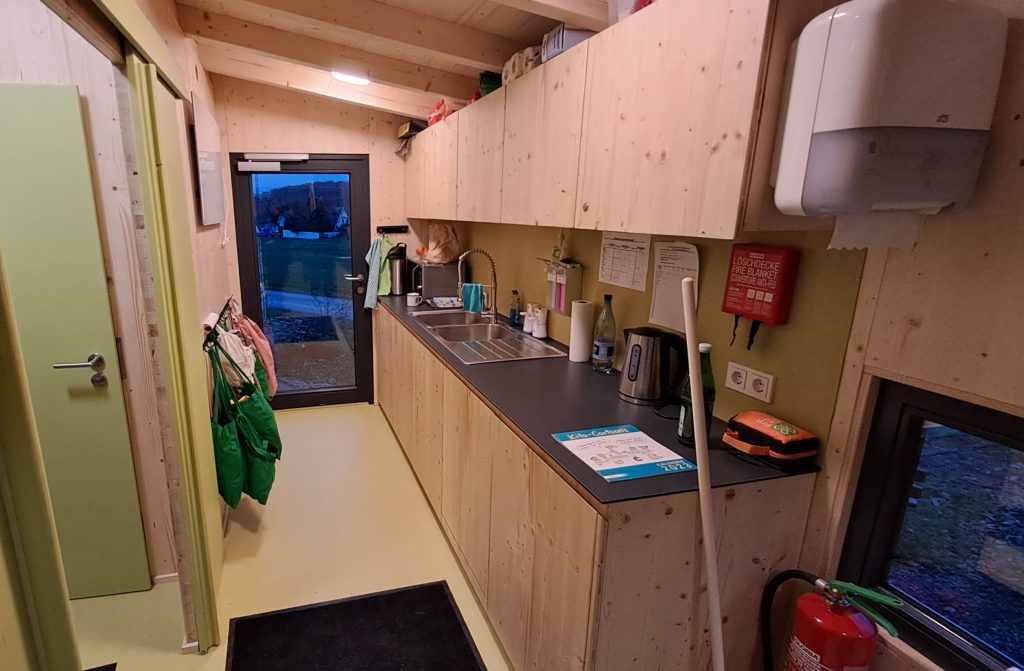 Das Anfang 2022 geführte Gespräch mit allen Verantwortungsträgern zahlte sich nicht nur dadurch aus, dass dabei eine solch zeitgemäße und zukunftsträchtige Lösung gefunden wurde. „Wir konnten auch gleich klären, was es an Genehmigungen und Formalitäten bedarf, um einen 8-Stunden-Betrieb hier draußen zu ermöglichen.“ Unzählige Telefonate und Absprachen mit Behörden blieben Lankes trotzdem nicht erspart. Umso erfreuter zeigt er auf das 9,40 Meter lange und drei Meter breite mobile Holzhaus, das jetzt neben dem Sportplatz und der Grillhütte steht und bereits jeden Tag von elf Kindern begeistert angenommen wird. Der Erste Beigeordnete Stefan Mäncher erstellte die notwendigen Zeichnungen für die beiden Gebäude, das auf die Anforderungen der Behörden abgestimmt nach erfolgter Ausschreibung von der Firma Holzbau Kappler in Gackenbach-Dies angefertigt wurde. Im vergangenen September gingen die Arbeiten los, Mitte Dezember wurde das 8,5 Tonnen schwere und mobile Holzhaus aufgebaut. Mit einem Tieflader kann das Tiny-House auch bei Bedarf umgesetzt werden.