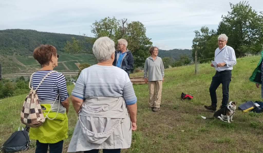 FILSEN/RHEIN-LAHN. (17. August 2023) Das Wetter meinte es gut mit den Teilnehmenden, die sich auf Einladung des evangelischen Dekanats Nassauer Land zum „Walk and talk“ auf dem Kirschenpfad in Filsen auf den Weg gemacht hatten. Ralph Skähr-Zöller von der Projektstelle für innovative Arbeit für jüngere Seniorinnen und Senioren führte die Gruppe nicht nur bergan bis zum Rheinsteig und zurück in den Ort; er sorgte auch für reichlich Impulse, die das Wandern und Erzählen am Rhein bereicherten.