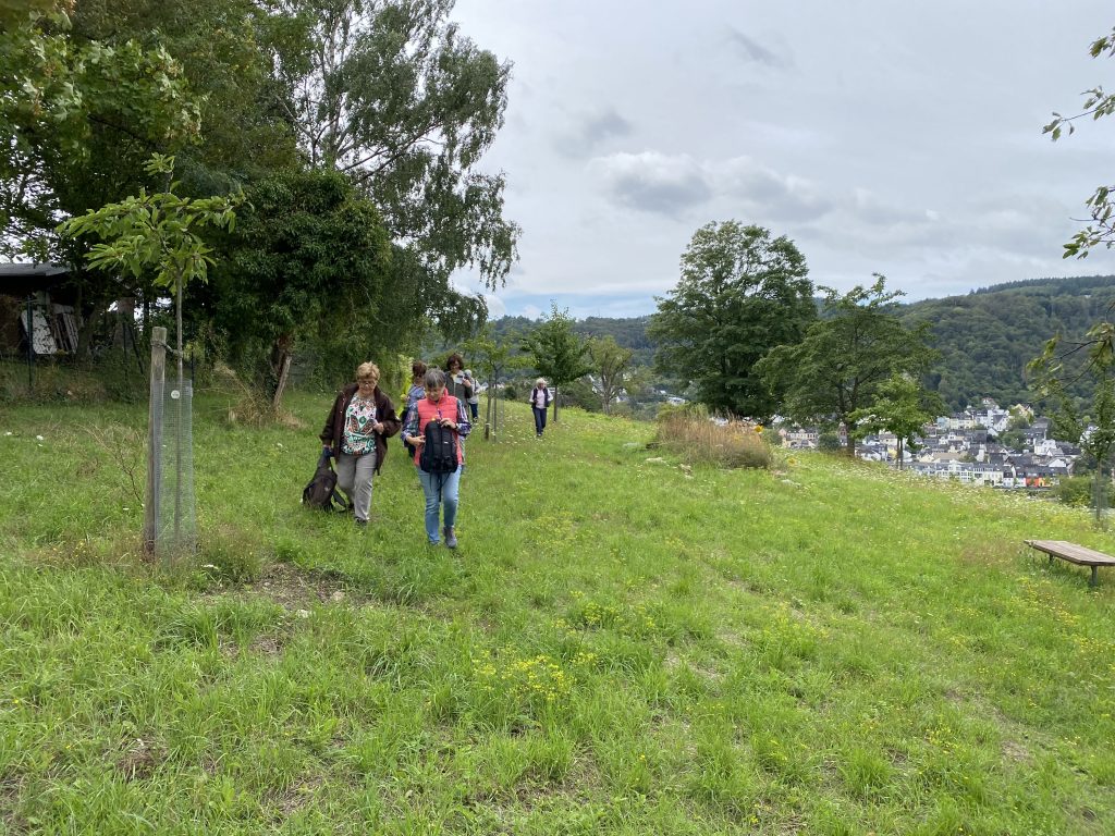 Zwischendurch gab es reichlich Natur zu genießen auf dem abwechslungsreichen Weg. Hier wurden die Kräuter auf einer Wiese bestimmt, dort verschiedene Pilze; die Gruppe passierte Bienenkörbe und eine Bienenweide, erfreute sich an Obstbäumen und am Blick aus der Höhe auf den Rhein und auf Boppard. Zurück in Filsen ging es zum Abschluss in die katholische Kirche St. Margaretha, die seit einiger Zeit als „Radwegekirche“ bekannt ist. Annemarie Reifferscheid betreut das Projekt als einen „Rastplatz für Leib und Seele“ und berichtete von der Entstehung der Fahrradkirche, den Angeboten von der Flasche Wasser übers Reifen-Flickzeug bis zum Reisesegen. Und sie machte den Anwesenden Lust, die Gemeinde und das Rheintal noch einmal mit dem Bike zu erfahren. Skähr-Zöller freute sich über das positive „Feedback“ unter den Teilnehmenden und den vielfach geäußerten Wunsch, mit „Walk and Talk“ auch noch andere Orte der Region zu erkunden und dabei wandernd Leib, Seele und Denken zu bereichern.